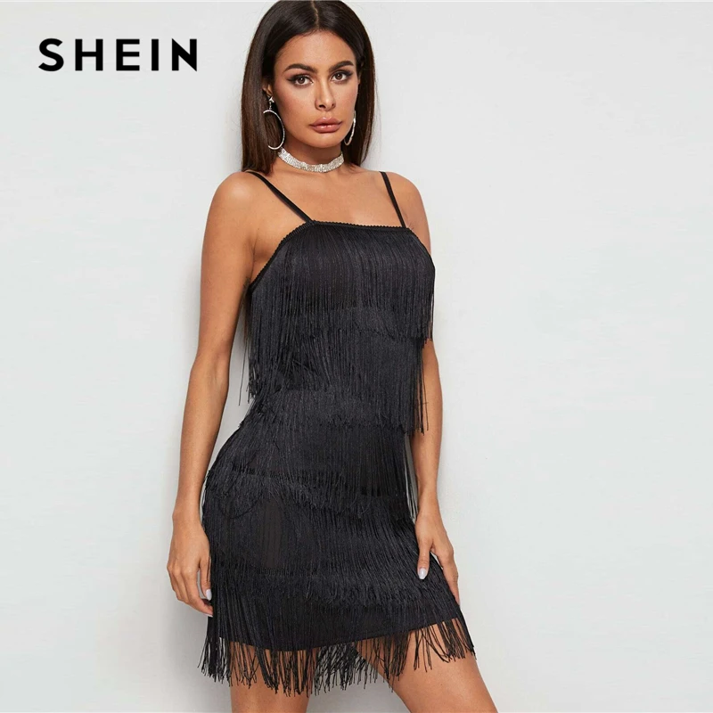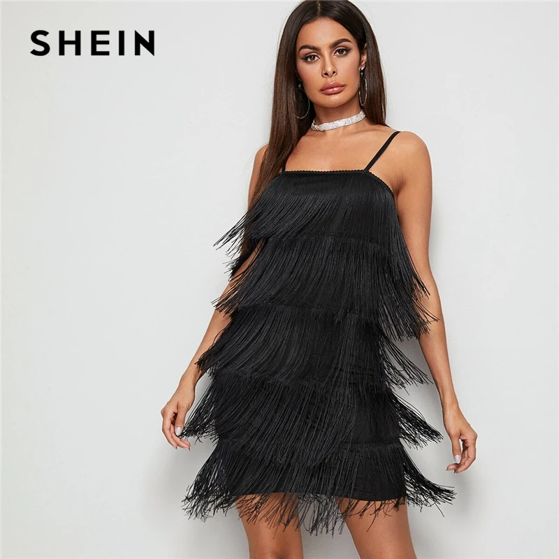 ORIGINAL SHEIN Black Tiered Layer Fringe Glamorous Cami Dress Women 2020 Spring Sleeveless Solid Party Zippe