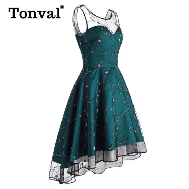 ORIGINAL Tonval Floral Embroidered Mesh Sweetheart Party Dress Women Lace Up Back High Low Hem Fit and Flare