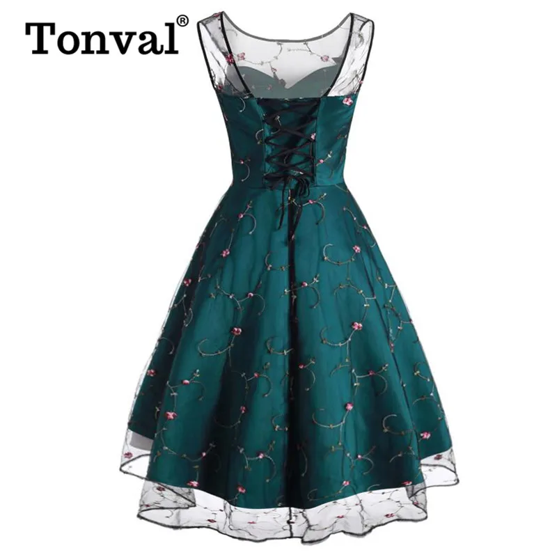 BEST QUALITY Tonval Floral Embroidered Mesh Sweetheart Party Dress Women Lace Up Back High Low Hem Fit and Flare